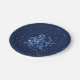 Paper plate featuring the symbol for Sagittarius in soft silver blue, overlaid with the stars of the constellation, against a starry sky background in deep midnight blue