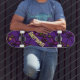Sagittarius inspired skateboard design. Purple background with bow and arrow motifs. Customizable text. Part of the Zodiac skateboard collection.