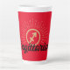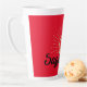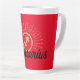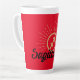 Zodiac themed latte mug features gold starburst accented Sagittarius astrology symbol with black text on red background