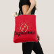 Astrology themed tote bag features gold starburst accented Sagittarius zodiac symbol with black text on red background