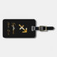 Elegant luggage tag with gold sagittarius sign on black background.