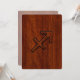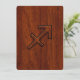 A Sagittarius zodiac sign on a rich brown mahogany wood grain style texture print background. A classy modern racy design for a great custom birthday gift idea.