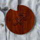 A Sagittarius zodiac sign on a rich brown mahogany wood grain style texture print background. A classy modern racy design for a great custom birthday gift idea.