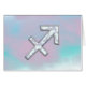 A mother of pearl Sagittarius zodiac symbol on a vibrant pastel baby blue and pink decor print background. A modern design for a great custom birthday gift idea for her.
