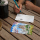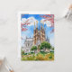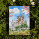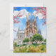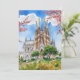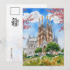 This postcard features a watercolor portrait of Sagrada Familia in Barcelona, Spain.