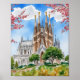 This art print features a watercolor portrait of Sagrada Familia in Barcelona, Spain.