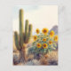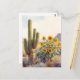 This postcard design beautifully blends desert and floral charm, featuring a tall saguaro cactus alongside a vibrant cluster of golden sunflowers. With mountains in the background and warm desert light illuminating the scene, the artwork captures the unique harmony of the American Southwest.