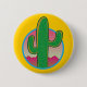 A green saguaro cactus is centred in a large circle with a blue border. There is an orange glow that highlights the sides of the cactus. Behind the cactus there is a mountain range, dark pink under the pink sunset sky.