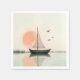 A sailboat drifts serenely on calm water with a large orange sun setting in the background and birds flying nearby