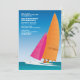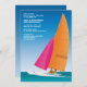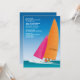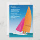 A sunny invitation with all the sights and colours of summer on the water. The card features a beautiful blue sky with a white catamaran sailboat. The boat has hot pink and orange sails and a couple on board. The perfect summer invitation for any occasion or gender.