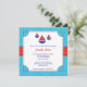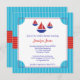 Cute, modern and colourful baby shower invitation. This invitation is ideal for a baby shower with a nautical theme. It features sail boats inside an ornate frame in a red, blue and white colour palette.