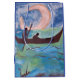 Join in the magic and mystery of sailing by moonlight with this gorgeous watercolor. Painted in soft pastel colors, the two intrepid travellers sail toward a calmer future against the background of the night sky and a huge crescent moon. The green, blue, brown and silver combine to create a warm and beautiful picture that will light up any room.