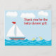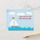 A bright and cheery sailboat baby shower postcard thank you note that coordinates with the "Sailboat Nautical" baby shower invitations. Graphics are on both sides for an additional decorative touch. Original vector art by Night Owl's Menagerie, 2013.