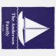 A white sailboat is on a dark blue blanket. Text is below the waves. You can edit the text to show a custom message such as the family's name and the year the family was established.