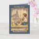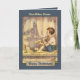 Delightful vintage scene features a young boy whittling a wooden boat as he gazes at an imagined sailboat on the wall beside him. Text says Dust off those Dreams. Happy Retirement. Customise inside text with your greeting, message and signature.