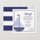 This nautical baby shower invitation features a sweet and simple sail boat and navy stripes on the back. It is available with red or yellow accents. Matching party favour stickers and keepsake tags are also in the shop.