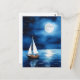Postcard in an illustration of a sailboat drifting peacefully on a calm, moonlit sea, surrounded by a starry night sky. The full moon casts a gentle reflection on the water, creating a serene and tranquil scene.