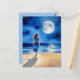 Postcard in an illustration of a sailboat drifting peacefully on a calm, moonlit sea, surrounded by a starry night sky. The full moon casts a gentle reflection on the water, creating a serene and tranquil scene.