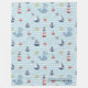 Dive into a delightful underwater adventure with this charming, personalized nautical pattern. Against a soft blue, wavy stripe background, adorable hand-drawn illustrations of smiling blue whales, cheerful sailboats, classic red and white lighthouses, anchors, starfish, and compasses create a fun, repeating design. This playful, gender-neutral pattern is perfect for adding a touch of coastal whimsy to a baby nursery, toddler bedroom or playroom. The simple, cheerful art style and soothing colors evoke the joy of the ocean and make it an ideal choice for creating a bright, breezy maritime space. Search ID1228 to see other products with this cute pattern. Note: design adapted from generative content.