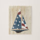 © Avery Tillmon / Wild Apple. Sailboat with American Flag on Wood background