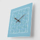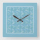 A stylish square clock with a nautical theme of sailing boats and seagull in white on a light sea blue background.