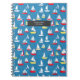 Pattern with illustration of red and yellow sailboats over blue background with name inside grey rectangle at front.