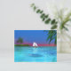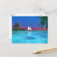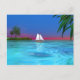 A tropical water scene with a sailboat. You can move or delete content on the back of the postcard by clicking the "customise it" button.