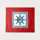 Nautical themed design with sailing scene decoration in striped squares on red background