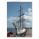 This sparkling white hull stands out against a beautiful sky. The old tall ship awaits the tide to head out of port. This photograph was taken in New Bedford, Massachusetts. Blank card.