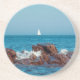 A photograph of a sailboat on the horizon, and waves crashing into the rock formation near the shore.