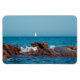 A photograph of a sailboat on the horizon, and waves crashing into the rock formation near the shore.