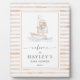 This baby shower welcome sign features a timeless beige tan stripe design with a sweet watercolour sailor teddy bear illustration. The script "welcome" heading is an image that cannot be edited. All of the other text is fully editable. For more advanced customisation of this design, simply select the "Customise It" button above.