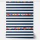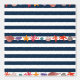 Sailor fabric with fun seashells, shells, starfish, coral on a white and navy blue striped background. 8 inches.