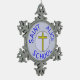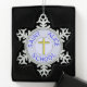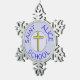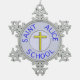 Colour Patch Saint Alice School Christmas Ornament. Grey Blue background with Bright Blue lettering and Gold Cross Framed by a snowflake ornament