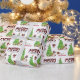 The repeated pattern on this cute Christmas wrapping paper is an image of a beautiful Saint Bernard Dog wearing a red and white Santa hat. The dog sits among brightly wrapped gift packages beside a decorated Christmas tree. A bullfinch bird is landing on the tree behind it. Stylised red and black buffalo plaid text says MERRY CHRISTMAS", and your own signature is in two fields for you to customise.