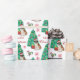 Anyone who has lost their heart to a big loveable St Bernard will love this Holiday wrapping paper! The dog wears a red and white Santa hat, and sits in front of a decorated Holiday tree. The image is repeated across the surface, and there are red snowflakes and striped candy canes between the images. Also between the images is red text that says "Merry Christmas". Everything is placed on a white background.