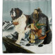 A Saint Bernard dog and a dwarf are out on a winter day either taking a walk or out on a search.