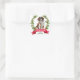 On these Holiday correspondence stickers, a watercolor image of a Saint Bernard Dog is surrounded by a red berry holly wreath. At the bottom is a red banner with your custom Christmas greeting, and your signature is in green beneath it.