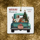 A teal blue retro pickup truck carries a decorated Holiday tree and gift packages on this cute Christmas ornament. Looking out from the tailgate is a beautiful Saint Bernard dog. A rustic wooden sign on the back bumper says "Christmas Cheer". The red and green stylised text at the top left says "MERRY CHRISTMAS", with your name (or your dog's) and the year at the right. Both sides have the same image.