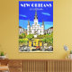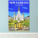 Saint Louis Cathedral features a vintage retro art travel image which shows the famous cathedral in New Orleans, Louisiana.