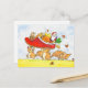 The card shows two adult red squirrels drawn in a cartoon style. They are running from right to left. Together they are carrying a red shoe with a plush inner lining. The shoe is stuffed full of nuts of all kinds (hazelnuts, walnuts, almonds, peanuts), a star shaped christmas cookie, a chocolate santa, and some decorative pine needle twigs. Some of the nuts are falling out of the shoe as the squirrels run. A small squirrel runs behind them, arms full with more nuts. And another little squirrel is sat on the point of the shoe, holding a large walnut and smiling contently.