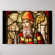Saint Patrick with his staff set a stained glass window in an old church building. Vintage artwork in public domain.