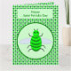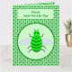 This big card features a graphic image of a cute little green bee with light and dark green stripes and green antennae. This cute little bumblebee is ready to celebrate Saint Patricks Day. The bee is surrounded by a pattern of light and dark green shamrocks to complete the design.