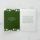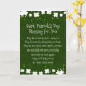 Inspirational Saint Patrick's Blessing greeting card depicts a dark green background with white shamrocks. It features the beloved Irish Blessing; "MAY THE ROAD rise up to meet you. MAY THE WIND be always at your back. MAY THE SUN shine warm upon your face; the rains fall soft upon your fields and until we meet again, MAY GOD HOLD YOU in the palm of His hand." The inside Bible Verse Jeremiah 31:3, "I have loved you with an everlasting love."