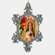 Saint Rose of Lima is surrounded by an arrangement of beautiful, colourful flowers and ornate scroll work. A background of yellow brocade compliments the elaborate illustration collage.