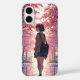 High-quality anime phone case showing a girl walking under falling cherry blossoms in gentle rain. Perfect for anime fans who love serene, pastel, and aesthetic designs.