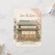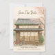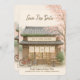 This save the date invitation reflects the beauty of a destination wedding in Japan, inspired by the romantic cherry blossoms of Kyoto and the cultural elegance of traditional tea houses. Sakura flowers bloom around wooden facades with noren curtains, while temple and shrine elements create a serene, timeless atmosphere. The floral motifs and delicate lines echo both the natural grace of spring and the artistry of East Asian traditions, blending Kyoto’s charm with hints of Tokyo’s modern spirit. Perfect for wedding invitations, stationery, and decorative art, it captures the balance between romance, culture, and minimalism.