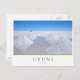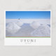 Photo postcard of drying piles of salt with reflection in the water waiting for the harvest on the Salar the Uyuni salt flats in southern Bolivia with the text 'Uyuni, Bolivia' in a white box and with stripes in red, yellow and green, the colours of the bolivian flag.