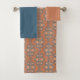 This towel set has a rust washcloth, a slate blue hand towel, and a bath towel with an art deco design of three salmon ovals broken across two very thin salmon rectangles with slate blue lines on a field of rust. Want the same design with different colours? Message me.