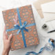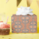 This wrapping paper has an art deco design of three salmon ovals broken across two very thin salmon rectangles with slate blue lines on a field of rust. Want the same design with different colours? Message me.